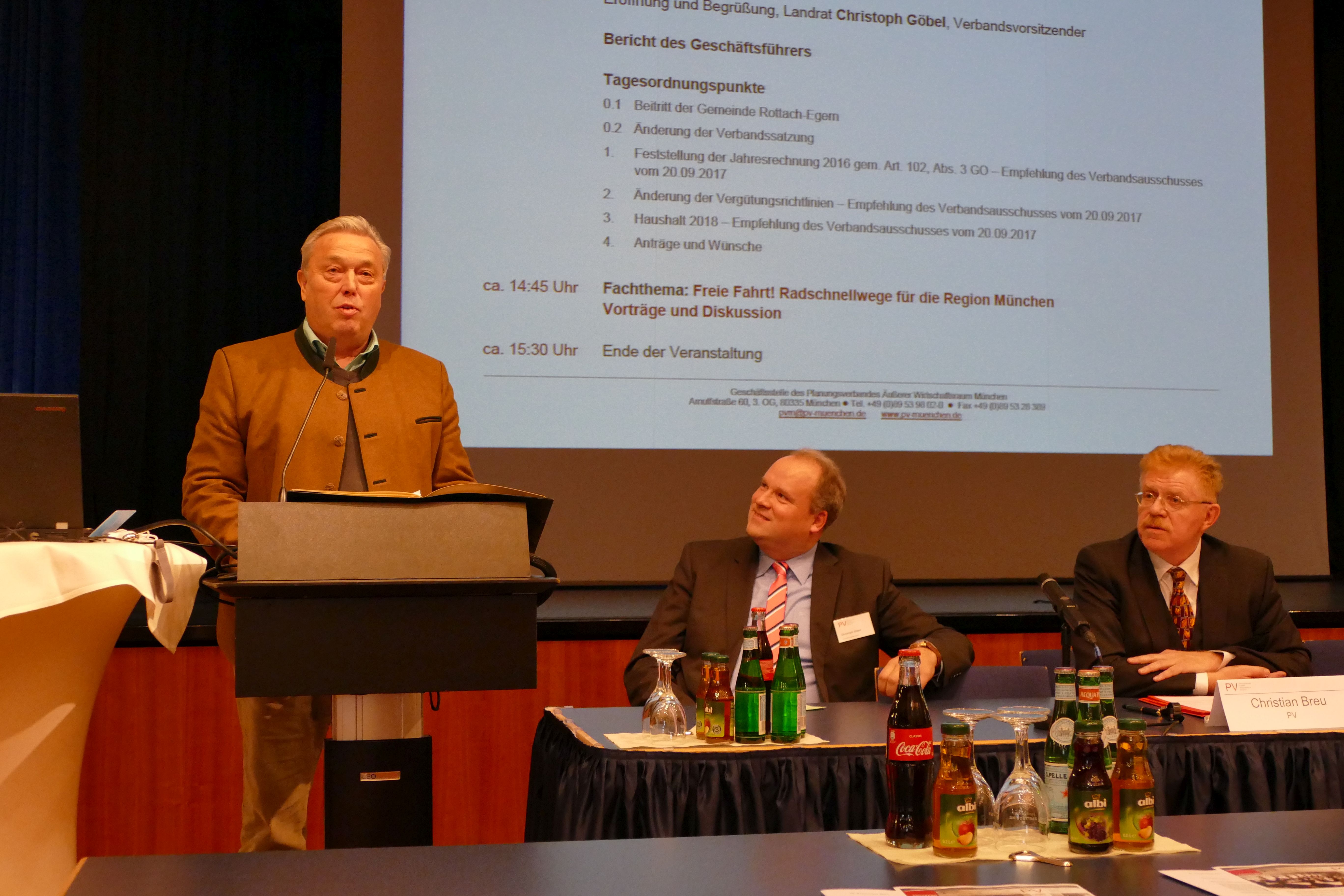 München (16.11.2017) – Die Mitglieder des Planungsverbands Äußerer Wirtschaftsraum München (PV) haben auf ihrer Verbandsversammlung den Beitritt der Gemeinde Rottach-Egern (Landkreis Miesbach) beschlossen. Die Versammlung fand gestern in Eching im Landkreis Freising statt. Geschäftsführer Christian Breu ging in seinem Bericht auf das Wachstum und die kommunale Entwicklung in der Region München ein. Beim Fachthema drehte sich alles um die Radschnellwege in der Region München: Landrat Christoph Göbel, Landkreis München, Florian Paul, Radverkehrsbeauftragter der Landeshauptstadt München, und Mobilitätsexpertin Birgit Kastrup vom PV informierten über den aktuellen Status und künftige Planungen.